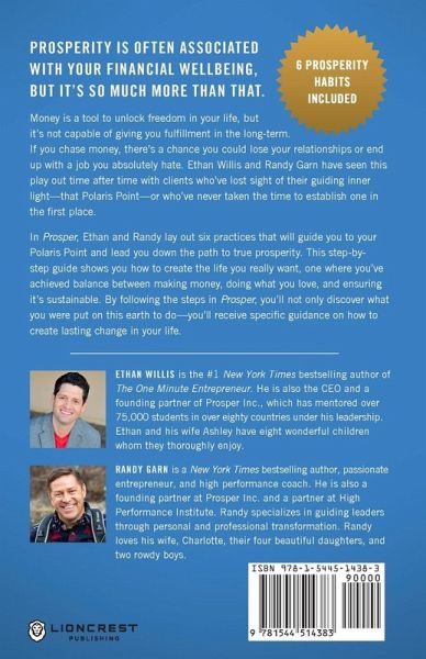 Prosperity is often associated with your financial wellbeing, but it's so much more than that. Money is a tool to unlock freedom in your life, but it's not capable of giving you fulfillment in the long-term. If you chase money, there's a chance you could lose your relationships or end up with a job you absolutely hate. Ethan Willis and Randy Garn have seen this play out time after time with clients who've lost sight of their guiding inner light-that Polaris Point-or who've never taken the time to establish one in the first place. In Prosper, Ethan and Randy lay out six practices that will guide you to your Polaris Point and lead you down the path to true prosperity. This step-by-step guide shows you how to create the life you really want, one where you've achieved balance between making money, doing what you love, and ensuring it's sustainable. By following the steps in Prosper, you'll not only discover what you were put on this earth to do-you'll receive specific guidance on how to create lasting change in your life.
