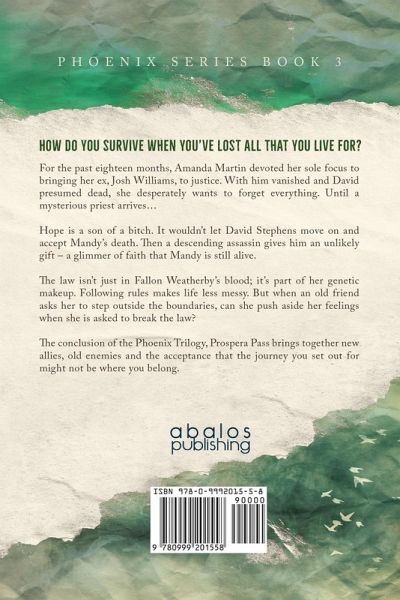 How do you survive when you’ve lost all that you live for? For the past eighteen months, Amanda Martin devoted her sole focus to bringing her ex, Josh Williams, to justice. With him vanished and David presumed dead, she desperately wants to forget everything. Until a mysterious priest arrives… Hope is a son of a bitch. It wouldn’t let David Stephens move on and accept Mandy’s death. Then a descending assassin gives him an unlikely gift – a glimmer of faith that Mandy is still alive. The law isn’t just in Fallon Weatherby’s blood; it’s part of her genetic makeup. Following rules makes life less messy. But when an old friend asks her to step outside the boundaries, can she push aside her feelings when she is asked to break the law? The conclusion of the Phoenix Trilogy, Prospera Pass brings together new allies, old enemies and the acceptance that the journey you set out for might not be where you belong.