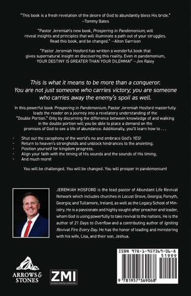 "This book is a fresh revelation of the desire of God to abundantly bless His bride."-Tommy Bates"Pastor Jeremiah's new book, Prospering in Pandemonium, willreveal insights and principles that will illuminate a path out of your struggles.Read this book, and be changed." -Alton Garrison"Pastor Jeremiah Hosford has written a wonderful book thatgives supernatural insight on discovering this reality. Even in pandemonium,YOUR DESTINY IS GREATER THAN YOUR DILEMMA!" -Jim Raley This is what it means to be more than a conqueror.You are not just someone who carries victory; you are someone who carries away the enemy's spoil as well.In this powerful book Prospering in Pandemonium, Pastor Jeremiah Hosford masterfully leads the reader on a journey into a revelatory understanding of the"Double Portion." Only by discerning the difference between knowledge of and walkingin the double portion will you be able to place a demand on thepromises of God to see a life of abundance. Additionally, you'll learn how to . . . Shut out the cacophony of the world's no and embrace God's YES!Return to heaven's strongholds and unblock hindrances to the anointing.Position yourself for kingdom progress.Align your faith with the timing of His sounds and the sounds of His timing.And much more! You will be challenged. You will be changed. You will prosper in pandemonium!