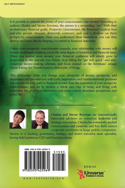 Is it possible to unleash the power of your consciousness over money? According to authors Chutisa and Steve Bowman, the answer is a resounding "yes." With their revolutionary financial guide, Prosperity Consciousness, the Bowman's explore how and why people obscure, diminish, contract, and cast a shadow on their prosperity consciousness. Once you understand these limitations, you can then destroy and undo the lies keeping you mired in financial insecurity. Unless your prosperity consciousness expands, your relationship with money will remain unchanged, trapping you at the same degree of limitation and financial mess. When you receive more money, your financial confusion will simply grow in proportion to the amount you obtain. Stop falling for "get rich quick" and anti-conscious money-making schemes, and focus instead on the Bowmans' unique Access Energy for Transformation philosophy of living. This philosophy helps you change your viewpoint of money, prosperity, and abundance and provides you with tools, inspiration, and transformational processes you can use on your path to financial success. Ease the expansion of your prosperity consciousness, and set in motion a whole new way of being and living with awareness. Let go of your limitations and create a more abundant, prosperous, and joyful life!