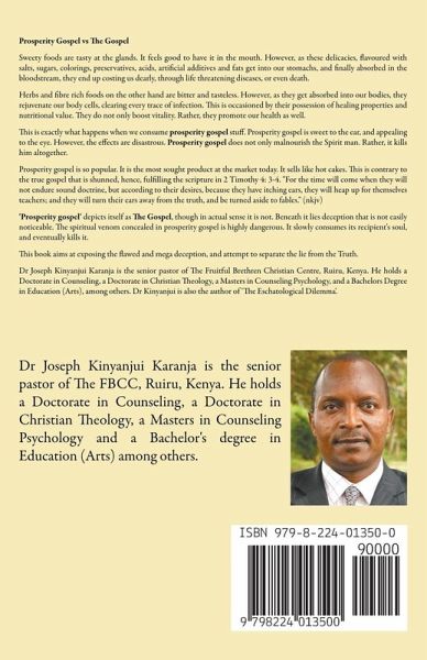 Prosperity Gospel vs The Gospel Sweety foods are tasty at the glands. It feels good to have it in the mouth. However, as these delicacies, flavoured with salts, sugars, colorings, Preservatives, acids, artificial additives and fats get into our stomachs, and finally absorbed in the bloodstream, they end up costing us dearly, through life threatening diseases, or even death. Herbs and fibre rich food on the other hand are bitter and tasteless. However, as they get absorbed into our bodies, they rejuvenate our body cells, clearing every trace of infection. This is occasioned by their possession of healing properties and nutritional value. They do not only boost vitality. Rather, they promote our health as well. This is exactly what happens when we consume prosperity gospel stuff. Prosperity gospel is sweet to the ear, and appealing to the eye. However, the effects are disastrous. Prosperity gospel does not only malnourish the Spirit man. Rather, it kills him altogether. Prosperity gospel is so popular. It is the most sought product at the market today. It sells like hot cakes. This is contrary to the true gospel that is shunned, hence, fulfilling the scripture in 2 Timothy 4: 3-4. "For the time will come when they will not endure sound doctrine, but according to their desires, because they have itching ears, they will heap up for themselves teachers; and they will turn their ears away from the truth, and be turned aside to fables." (nkjv) 'Prosperity gospel' depicts itself as The Gospel, though in actual sense it is not. Beneath it lies deception that is not noticeable. The spiritual venom concealed in prosperity gospel is highly dangerous. It slowly consumes its recipient's soul, and eventually kills it. This book aims at unveiling this flawed and mega deception, and attempt to separate the lie from the Truth. Dr Joseph Kinyanjui Karanja is the senior pastor of The Fruitful Brethren Christian Centre, Ruiru, Kenya. He holds a Doctorate in counseling, a Doctorate in Christian Theology, a Masters in Counseling Psychology, and a Bachelors degree in Education (Arts), among others. Dr Kinyanjui is also the author of 'The Eschatological Dilemma'.