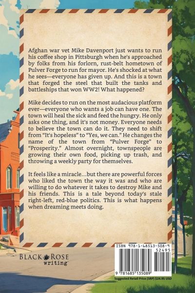 Afghan war vet Mike Davenport just wants to run his coffee shop in Pittsburgh when he's approached by folks from his forlorn, rust-belt hometown of Pulver Forge to run for mayor. He's shocked at what he sees-everyone has given up. And this is a town that forged the steel that built the tanks and battleships that won WW2! What happened? Mike decides to run on the most audacious platform ever-everyone who wants a job can have one. The town will heal the sick and feed the hungry. He only asks one thing, and it's not money. Everyone needs to believe the town can do it. They need to shift from "It's hopeless" to "Yes, we can." He changes the name of the town from "Pulver Forge" to "Prosperity." Almost overnight, townspeople are growing their own food, picking up trash, and throwing a weekly party for themselves. It feels like a miracle...but there are powerful forces who liked the town the way it was and who are willing to do whatever it takes to destroy Mike and his friends. This is a tale beyond today's stale right-left, red-blue politics. This is what happens when dreaming meets doing.