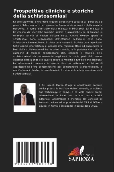 La schistosomiasi è una delle infezioni parassitarie causate dai parassiti del genere Schistosoma, che causano la forma acuta o cronica della malattia nell'uomo. Il nome alternativo della malattia è bilharziosi. La malattia è trasmessa da specifiche lumache anfibie o acquatiche che si trovano in un'ampia varietà di habitat d'acqua dolce. Cinque diverse specie di schistosomi sono responsabili dell'infezione dell'uomo; esse sono: Shistosoma haematobium, Schistosoma mansoni, Schistosoma japonicum, Schistosoma intercalatum e Schistosoma mekongi. Oltre ad apprendere le basi della schistosomiasi tra le altre malattie, è importante che tutte le categorie di studenti comprendano che, sebbene il controllo della schistosomiasi sia notevolmente migliorato in molte parti del mondo, esistono ancora sfide e la guerra contro la malattia è tutt'altro che conclusa. Le informazioni contenute in questo libro permetteranno al lettore di apprezzare gli sforzi contemporanei per comprendere la trasmissione, le manifestazioni cliniche, le complicazioni, il trattamento e la prevenzione della schistosomiasi.
