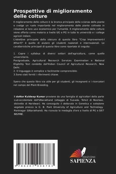 Il miglioramento delle colture è la branca principale della scienza delle piante e svolge un ruolo importante nel miglioramento delle piante coltivate in relazione al loro uso economico per l'umanità. Il miglioramento delle colture viene offerto come materia a livello UG e PG in tutte le università e i college agricoli indiani.L'obiettivo principale della stesura di questo libro "Crop Improvement-I (Kharif)" è quello di aiutare gli studenti nazionali e internazionali. Le caratteristiche principali di questo libro sono riportate di seguito:1. Copre i syllabus di diversi settori dell'agricoltura, come quello universitario,Postgraduate, Agricultural Research Services Examination e National Eligibility Test condotto dall'Indian Council of Agricultural Research, New Delhi.2. Il linguaggio è semplice e facilmente comprensibile.3.Sono stati forniti i riferimenti chiave.Spero che questo libro sia utile per gli studenti, gli insegnanti e i ricercatori nel campo del Plant Breeding.