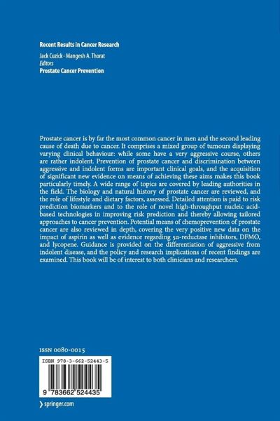 Prostate cancer is by far the most common cancer in men and the second leading cause of death due to cancer. It comprises a mixed group of tumours displaying varying clinical behaviour: while some have a very aggressive course, others are rather indolent. Prevention of prostate cancer and discrimination between aggressive and indolent forms are important clinical goals and the acquisition of significant new evidence on means of achieving these aims makes this book particularly timely. A wide range of topics are covered by leading authorities in the field. The biology and natural history of prostate cancer are reviewed and the role of lifestyle and dietary factors, assessed. Detailed attention is paid to risk prediction biomarkers and to the role of novel high-throughput nucleic acid-based technologies in improving risk prediction and thereby allowing tailored approaches to cancer prevention. Potential means of chemoprevention of prostate cancer are also reviewed in depth, covering the very positive new data on the impact of aspirin as well as evidence regarding 5 -reductase inhibitors, DFMO and lycopene. Guidance is provided on the differentiation of aggressive from indolent disease and the policy and research implications of recent findings are examined. This book will be of interest to both clinicians and researchers.