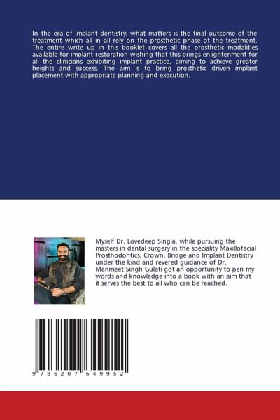 In the era of implant dentistry, what matters is the final outcome of the treatment which all in all rely on the prosthetic phase of the treatment. The entire write up in this booklet covers all the prosthetic modalities available for implant restoration wishing that this brings enlightenment for all the clinicians exhibiting implant practice, aiming to achieve greater heights and success. The aim is to bring prosthetic driven implant placement with appropriate planning and execution.