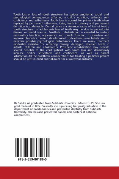 Tooth loss or loss of tooth structure has serious emotional, social, and psychological consequences affecting a child's nutrition, esthetics, self-confidence and self-esteem. Tooth loss is normal for primary teeth,when replaced by permanent otherwise, losing teeth in primary and permanent dentition is undesirable. Dental caries is a common cause of loss of tooth/ tooth structure. In adolescents loss of teeth may be due to periodontal disease or dental trauma. Prosthetic rehabilitation is essential to restore masticatory function, appearance and muscle function; to maintain and improve phonetics; prevent development of deleterious oral habits; and to minimize possible psychological disturbances. There are many treatment modalities available for replacing missing, damaged, diseased teeth in infants, children and adolescents. Prosthetic rehabilitation may provide several benefits to the child patient with tooth loss and dramatically increase his/her self-esteem and confidence, as well as parent satisfaction.All the prosthetic considerations for treating a pediatric patient should be kept in mind and followed for a successful outcome.