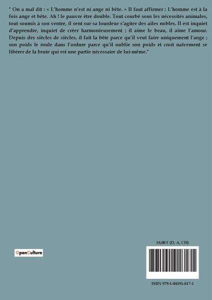 " On a mal dit : « L¿homme n¿est ni ange ni bête. » Il faut affirmer : L¿homme est à la fois ange et bête. Ah ! le pauvre être double. Tout courbé sous les nécessités animales, tout soumis à son ventre, il sent sur sa lourdeur s¿agiter des ailes nobles. Il est inquiet d¿apprendre, inquiet de créer harmonieusement ; il aime le beau, il aime l¿amour. Depuis des siècles de siècles, il fait la bête parce qüil veut faire uniquement l¿ange ; son poids le roule dans l¿ordure parce qüil oublie son poids et croit naïvement se libérer de la brute qui est une partie nécessaire de lui-même."
