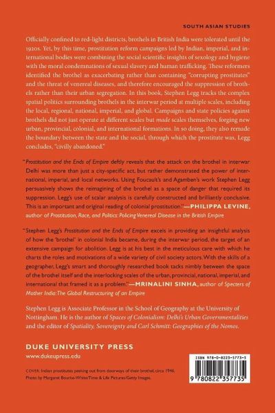 Officially confined to red-light districts, brothels in British India were tolerated until the 1920s. Yet, by this time, prostitution reform campaigns led by Indian, imperial, and international bodies were combining the social scientific insights of sexology and hygiene with the moral condemnations of sexual slavery and human trafficking. These reformers identified the brothel as exacerbating rather than containing "corrupting prostitutes" and the threat of venereal diseases, and therefore encouraged the suppression of brothels rather than their urban segregation. In this book, Stephen Legg tracks the complex spatial politics surrounding brothels in the interwar period at multiple scales, including the local, regional, national, imperial, and global. Campaigns and state policies against brothels did not just operate at different scales but made scales themselves, forging new urban, provincial, colonial, and international formations. In so doing, they also remade the boundary between the state and the social, through which the prostitute was, Legg concludes, "civilly abandoned."