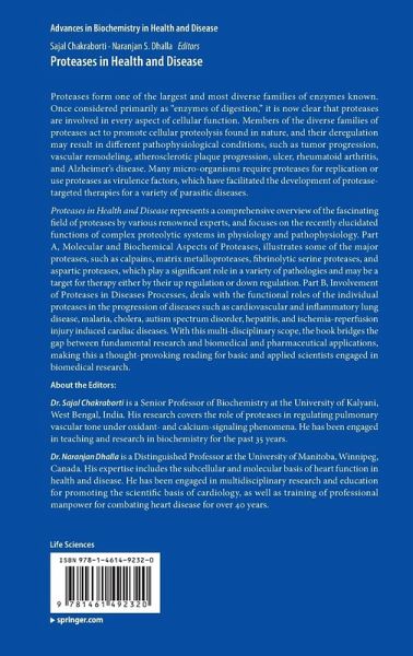 Part A: Molecular and Biochemical Aspects of Proteases.- 1. An Overview of Endoplasmic Reticulum Calpain System.- 2. Mitochondrial Calpains: Who, What, Where, When and Why?.- 3. Role of Calpains in Calmodulin Regulated Systems.- 4. Exercise and Matrix Metalloproteases: A Brief Overview.- 5. Regulation of Chondrocyte Matrix Metalloproteinase Gene Expression.- 6. Microbial Source of Fibrinolytic Protease and Its Biotechnological Potential.- 7. Aspartic Proteolytic Inhibitors Induce Cellular and Biochemical Alterations in Fungal Cells.- 8. Cysteine Proteases of Human Malaria Parasites.- 9. Proteases as Virulence Factors in Leishmania: Focus on Serine Proteases as Possible Therapeutic Targets.- 10. An Updated Inventory on Properties, Pathophysiology and Therapeutic Potential of Snake Venom Thrombin-like Proteases.- 11. Macrocyclic Protease Inhibitors Constrained into a beta-Strand Geometry.- Part B: Involvement of Proteases in Disease Processes.- 12. Regulation of MT1-MMP Activation and Its Relevance to Disease Processes.- 13. Role of Proteases During Intra-erythrocytic Developmental Cycle of Human Malaria Parasite Plasmodium falciparum.- 14. Proteases in Vibrio cholerae and Their Role in Pathogenesis.- 15. ADAMTS13: The von Willebrand Factor Cleaving Protease and Its Role in Thrombotic Thrombocytopenic Purpura.- 16. Role of Proteases and Their Tissue Inhibitors in Pregnancy Outcome.- 17. Matrix Metalloproteinases in Bone Health and Disease.- 18. Escalated Expression of Matrix Metalloproteinases in Osteoarthritis.- 19. Role of Proteases in Autism Spectrum Disorder.- 20. Role of Proteases in the Management of Hepatitis C Virus.- 21. Role of Protease in Inflammatory Lung Diseases.- 22. Involvement of Some Proteolytic Enzymes in Cardiac Dysfunction Due to Ischemia-Reperfusion Injury.