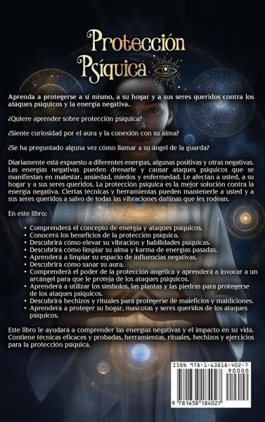 Aprenda a protegerse a sí mismo, a su hogar y a sus seres queridos contra los ataques psíquicos y la energía negativa. ¿Quiere aprender sobre protección psíquica? ¿Siente curiosidad por el aura y la conexión con su alma? ¿Se ha preguntado alguna vez cómo llamar a su ángel de la guarda? Diariamente está expuesto a diferentes energías, algunas positivas y otras negativas. Las energías negativas pueden drenarle y causar ataques psíquicos que se manifiestan en malestar, ansiedad, miedos y enfermedad. Le afectan a usted, a su hogar y a sus seres queridos. La protección psíquica es la mejor solución contra la energía negativa. Ciertas técnicas y herramientas pueden mantenerle a usted y a sus seres queridos a salvo de todas las vibraciones dañinas que les rodean, En este libro:Comprenderá el concepto de energía y ataques psíquicos. Conocerá los beneficios de la protección psíquica. Descubrirá cómo elevar su vibración y habilidades psíquicas. Descubrirá cómo limpiar su alma y karma de energías pasadas. Aprenderá a limpiar su espacio de influencias negativas. Descubrirá cómo sanar su aura. Comprenderá el poder de la protección angélica y aprenderá a invocar a un arcángel para que le proteja de los ataques psíquicos. Aprenderá a utilizar los símbolos, las plantas y las piedras para protegerse de los ataques psíquicos. Descubrirá hechizos y rituales para protegerse de maleficios y maldiciones. Aprenderá a proteger su hogar, mascotas y seres queridos de los ataques psíquicos. Este libro le ayudará a comprender las energías negativas y el impacto en su vida. Contiene técnicas eficaces y probadas, herramientas, rituales, hechizos y ejercicios para la protección psíquica.