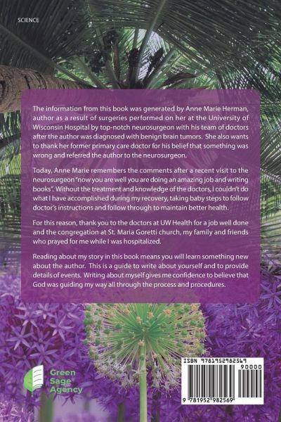 The information from this book was generated by Anne Marie Herman, author as a result of surgeries performed on her at the University of Wisconsin Hospital by top-notch neurosurgeon with his team of doctors after the author was diagnosed with benign brain tumors. She also wants to thank her former primary care doctor for his belief that something was wrong and referred the author to the neurosurgeon. Today, Anne Marie remembers the comments after a recent visit to the neurosurgeon "now you are well you are doing an amazing job and writing books". Without the treatment and knowledge of the doctors, I couldn't do what I have accomplished during my recovery, taking baby steps to follow doctor's instructions and follow through to maintain better health. For this reason, thank you to the doctors at UW Health for a job well done and the congregation at St. Maria Goretti church, my family and friends who prayed for me while I was hospitalized. Reading about my story in this book means you will learn something new about the author. This is a guide to write about yourself and to provide details of events. Writing about myself gives me confidence to believe that God was guiding my way all through the process and procedures.
