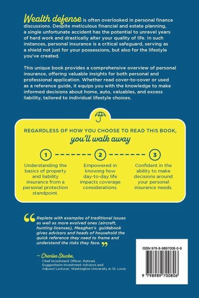 Wealth defense is often overlooked in personal finance discussions. Despite meticulous financial and estate planning, a single unfortunate accident has the potential to unravel years of hard work and drastically alter your quality of life. In such instances, personal insurance is a critical safeguard, serving as a shield not just for your possessions, but also for the lifestyle you've created. This unique book provides a comprehensive overview of personal insurance, offering valuable insights for both personal and professional application. Whether read cover-to-cover or used as a reference guide, it equips you with the knowledge to make informed decisions about home, auto, valuables, and excess liability, tailored to individual lifestyle choices. Regardless of how you choose to read this book, you'll walk away...Understanding the basics of property and liability insurance from a personal protection standpoint. Empowered in knowing how day-to-day life impacts coverage considerations. Confident in the ability to make decisions around your personal insurance needs.