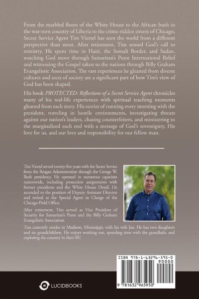 From the marbled floors of the White House to the African bush in the war-torn country of Liberia to the crime-ridden streets of Chicago, Secret Service Agent Tim Viertel has seen the world from a different perspective than most. After retirement, Tim sensed God's call to ministry. He spent time in Haiti, the Somali Border, and Sudan, watching God move through Samaritan's Purse International Relief and witnessing the Gospel taken to the nations through Billy Graham Evangelistic Association. The vast experiences he gleaned from diverse cultures and sects of society are a significant part of how Tim's view of God has been shaped. His book PROTECTED: Reflections of a Secret Service Agent chronicles many of his real-life experiences with spiritual teaching moments gleaned from each story. His stories of running every morning with the president, traveling in hostile environments, investigating threats against our nation's leaders, chasing counterfeiters, and ministering to the marginalized each end with a message of God's sovereignty, His love for us, and our love and responsibility for our fellow man.