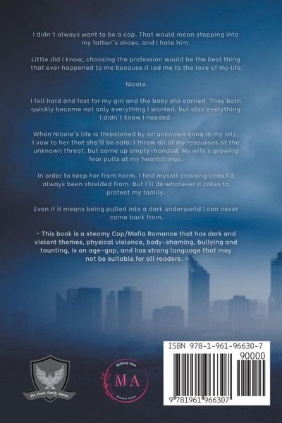 I didn't always want to be a cop. That would mean stepping into my father's shoes, and I hate him. Little did I know, choosing the profession would be the best thing that ever happened to me because it led me to the love of my life. Nicole. I fell hard and fast for my girl and the baby she carried. They both quickly became not only everything I wanted, but also everything I didn't know I needed. When Nicole's life is threatened by an unknown gang in my city, I vow to her that she'll be safe. I throw all of my resources at the unknown threat, but come up empty-handed. My wife's growing fear pulls at my heartstrings. In order to keep her from harm, I find myself crossing lines I'd always been shielded from. But I'll do whatever it takes to protect my family. Even if it means being pulled into a dark underworld I can never come back from. ~ This book is a steamy Cop/Mafia Romance that has dark and violent themes, physical violence, body-shaming, bullying and taunting, is an age-gap, and has strong language that may not be suitable for all readers. ~