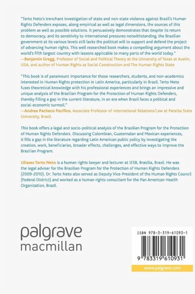 Chapter 1: Introduction.- Chapter 2: Protection of Human Rights Defenders.- Chapter 3: Brazil's Path Towards Human Rights.- Chapter 4: State and Civil Society's Responses to State and Non-State Actors' Violence Towards Human Rights Defenders.- Chapter 5: The Path to the Creation of the Program for the Protection of Human Rights Defenders.- Chapter 6: The Legal Framework and Legal Functioning of the Program for the Protection of Human Rights Defenders.- Chapter 7: The Effects in Practice of the Program for the Protection of Human Rights Defenders.- Chapter 8: The Broader Effects of the Program for the Protection of Human Rights Defenders.- Chapter 9: What is Preventing the Program for the Protection of Human Rights Defenders from Fulfilling its Potential, and What Can Be Done?.- Chapter 10: Conclusion.