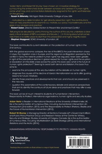 Introduction: Denial, Fatalism and the Protection of Human Rights, Aidan Hehir Part I: Rethinking Fundamental Principles 1. Global Constituent Power: Protests and Human Rights, Anthony F Lang, Jr 2. A Critical Examination of "Humanity", Samuel Jarvis 3. Failed Interventions and the Inherent Contradictions of Liberal Internationalism, Eric A. Heinze 4. Humanitarian Intervention in Post-American International Society, Robert W. Murray Part II: "Protection" and Peacekeeping 5. The Uncertainties of International Protection, Kelly Staples 6. UN Peacekeeping and the Protection of Civilians Norm, Tom Keating 7. From Showpiece Interventions to Day-to-Day Civilian Protection: Western Humanitarian Intervention and UN Peacekeeping, Jonathan Gilmore and David Curran 8. The Responsibility to Protect or the Protection of Civilians: Which Policy Brand is more "Successful"?, Catherine Jones Part III: The Responsibility to Protect and Beyond 9. Norm Complexity and Contestation: Unpacking the R2P, Alan Bloomfield 10. "Why is it that we keep failing?" The Responsibility to Protect as a Hollow Norm, Aidan Hehir 11. Guns Vs Troops: The Ethics of Supplying Arms, James Pattison 12. The Limits of R2P and the Case for Pacifism, Jeremy Moses 13. The Responsibility to Protect: A Long View, Justin Morris Conclusion: The Future of Human Rights Protection, Robert W. Murray