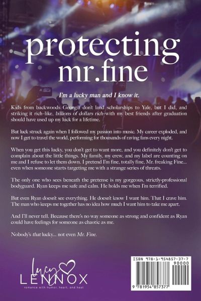 I'm a lucky man and I know it. Kids from backwoods Georgia don't land scholarships to Yale, but I did, and striking it rich-like, billions of dollars rich-with my best friends after graduation should have used up my luck for a lifetime. But luck struck again when I followed my passion into music. My career exploded, and now I get to travel the world, performing for thousands of raving fans every night. When you get this lucky, you don't get to want more, and you definitely don't get to complain about the little things. My family, my crew, and my label are counting on me and I refuse to let them down. I pretend I'm fine, totally fine, Mr. freaking Fine... even when someone starts targeting me with a strange series of threats. The only one who sees beneath the pretense is my gorgeous, strictly-professional bodyguard. Ryan keeps me safe and calm. He holds me when I'm terrified. But even Ryan doesn't see everything. He doesn't know I want him. That I crave him. The man who keeps me together has no idea how much I want him to take me apart. And I'll never tell. Because there's no way someone as strong and confident as Ryan could have feelings for someone as chaotic as me. Nobody's that lucky... not even Mr. Fine.