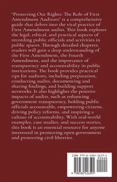 "Protecting Our Rights: The Role of First Amendment Auditors" is a comprehensive guide that delves into the vital practice of First Amendment audits. This book explores the legal, ethical, and practical aspects of recording public officials and activities in public spaces. Through detailed chapters, readers will gain a deep understanding of the First Amendment, the Fourth Amendment, and the importance of transparency and accountability in public institutions. The book provides practical tips for auditors, including preparation, conducting audits, documenting and sharing findings, and building support networks. It also highlights the positive impacts of audits, such as enhancing government transparency, holding public officials accountable, empowering citizens, driving policy reforms, and inspiring a culture of accountability. With real-world examples, case studies, and success stories, this book is an essential resource for anyone interested in promoting open government and protecting civil liberties.