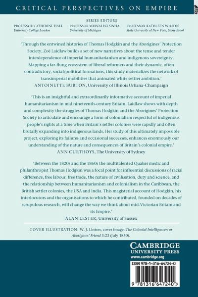 Laidlaw lays bare the contradictions of mid-nineteenth-century imperial Britain. Missionaries, scientists and imperial officials all claimed an interest in 'protecting' and 'civilizing' indigenous peoples, but this study of Quaker activist Thomas Hodgkin and the Aborigines' Protection Society reveals the fatal flaws in imperial 'humanitarianism'.