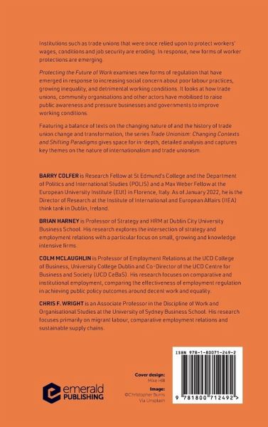 Barry Colfer is Research Fellow at St Edmund's College and the Department of Politics and International Studies (POLIS) and a Max Weber Fellow at the European University Institute (EUI) in Florence, Italy. As of January 2022, he is the Director of Research at the Institute of International and European Affairs (IIEA) think tank in Dublin, Ireland. Brian Harney is Professor of Strategy and HRM at Dublin City University Business School. His research explores the intersection of strategy and employment relations with a particular focus on small, growing and knowledge intensive firms. Colm McLaughlin is Professor of Employment Relations at the UCD College of Business, University College Dublin, and Co-Director of the UCD Centre for Business and Society (UCD CeBaS). His research focuses on comparative and institutional employment, comparing the effectiveness of employment regulation in achieving public policy outcomes around decent work and equality. Chris F. Wright is an Associate Professor in the Discipline of Work and Organisational Studies at the University of Sydney Business School. His research focuses primarily on migrant labour, comparative employment relations and sustainable supply chains.