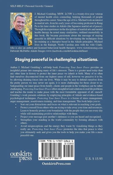 Protecting Your Inner Peace is a step-by-step guide on how to maintain peace within yourself during challenging times. Author J. Michael Goulding blends his twenty-five years of experience in mental health crisis intervention with his martial arts background. Goulding incorporates the Aikido concepts (The Japanese Art of Peace) into practical steps for maintaining peaceful verbal interactions with people while also meeting your needs. Like Aikido, you do not have to harm your opponent in order to protect yourself. There are verbal ways to maintain your position without having to hurt the feelings of others. Goulding outlines these steps in an easy to use technique that everyone can quickly apply to their lives. In today's stressful times, many people are finding a greater need to protect the inner peace they are given at birth. Many of us often find ourselves disconnected from our highest sense of self, however we perceive it to be, by allowing draining forces into our lives. It is easy to protect ourselves from the pushy person we may never see again, but how do we protect ourselves from family, clients and people in the workplace? Protecting Your Inner Peace offers easy solutions to real life problems and teaches us to make peace with the most powerful opponent of all, ourselves. This book offers solutions by employing the principles from the martial arts form of Aikido (Japanese art of peace) and research-based psychological techniques. Regardless of your goals or relationship aspirations Protecting Your Inner Peace conveys the message that peace is what you ultimately seek and gives you the tools to help you make your life a more peaceful one. Protecting Your Inner Peace is a fusion of stress management, anger management, assertiveness training, and time management. This book helps you to: * Sort out your distractions and focus on the life that is relevant to reaching your goals. Much of our culture is focused on adding as much as you can to your life. You will learn to prioritize, and learn the techniques to drop the extra baggage that is weighing you down. * Protect yourself from others who are trying to take away your time and resources. Learn to honestly protect your boundaries with the people that you see every day while still maintaining positive relationships with them. * Get your message past another person's defenses so you are actually heard. Many times we know what to say, and we mean the best for everyone involved. However, often times our message may not be heard. You will learn the approach to prepare your listener to be open to your message as you deliver your message. * Form alliances with others so you can strengthen your social network. By applying a simple test to your relationships, you will learn how to screen out the people who will be helpful and supportive to your cause from the people who will work against you. * See things as they are so you do not have to waste any energy on misperceptions. Many times we add meaning to neutral messages we receive from others. If we add too positive a meaning, then we may end up in dangerous situations. If we add too negative a meaning to our situations, then we push positive people away from us. Protecting Your Inner Peace promotes the idea that peace is what you ultimately seek and gives you the tools to help you make your life a more peaceful one.