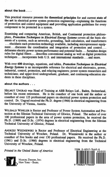 Presenting the theoretical principles for, and current state of, electrical power system protection engineering, this work explains the functions of protection and control equipment. It provides application guidelines for every component to be protected in a system, and examines and compares American, British and continental protection philosophies.