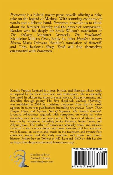 Protectress is a hybrid poetry-prose novella offering a risky take on the legend of Medusa. With stunning economy of words and a delicate hand, Protectress provokes us to think about the feminist identity and the power of compassion. Readers who fell deeply for Emily Wilson's translation of The Odyssey, Margaret Atwood's The Penelopiad, Madeleine Miller's Circe, Emily St. John Mandel's Station Eleven, Maria Dahvana Headley's translation of Beowulf, and Toby Barlow's Sharp Teeth will find themselves enamoured with Protectress.