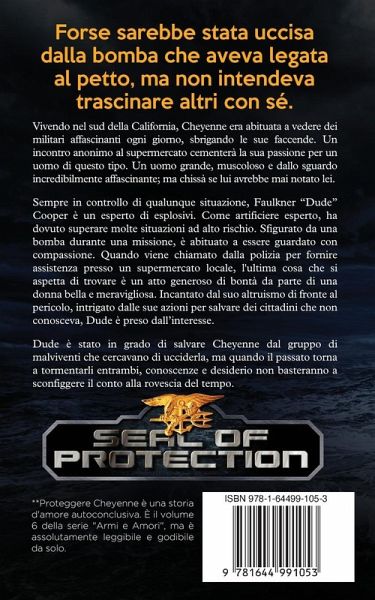 Vivendo nel sud della California, Cheyenne era abituata a vedere dei militari affascinanti ogni giorno, sbrigando le sue faccende. Un incontro anonimo al supermercato cementerà la sua passione per un uomo di questo tipo. Un uomo grande, muscoloso e dallo sguardo incredibilmente affascinante; ma chissà se lui avrebbe mai notato lei. Sempre in controllo di qualunque situazione, Faulkner "Dude" Cooper è un esperto di esplosivi. Come artificiere esperto, ha dovuto superare molte situazioni ad alto rischio. Sfigurato da una bomba durante una missione, è abituato a essere guardato con compassione. Quando viene chiamato dalla polizia per fornire assistenza presso un supermercato locale, l'ultima cosa che si aspetta di trovare è un atto generoso di bontà da parte di una donna bella e meravigliosa. Incantato dal suo altruismo di fronte al pericolo, intrigato dalle sue azioni per salvare dei cittadini che non conosceva, Dude è preso dall'interesse. Dude è stato in grado di salvare Cheyenne dal gruppo di malviventi che cercavano di ucciderla, ma quando il passato torna a tormentarli entrambi, conoscenze e desiderio non basteranno a sconfiggere il conto alla rovescia del tempo. **Proteggere Cheyenne è il sesto libro della serie "Armi e Amori". Il libro è autoconclusivo, ma vi consigliamo di leggere i volumi in ordine per godervi al meglio la serie.