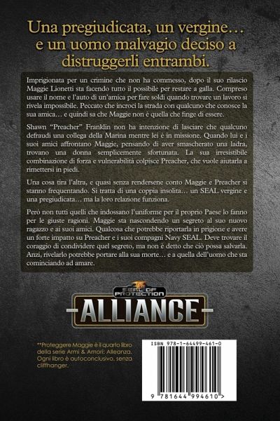 Una pregiudicata, un vergine... e un uomo malvagio deciso a distruggerli entrambi. Imprigionata per un crimine che non ha commesso, dopo il suo rilascio Maggie Lionetti sta facendo tutto il possibile per restare a galla. Compreso usare il nome e l'auto di un'amica per fare soldi quando trovare un lavoro si rivela impossibile. Peccato che incroci la strada con qualcuno che conosce la sua amica... e quindi sa che Maggie non è quella che finge di essere. Shawn "Preacher" Franklin non ha intenzione di lasciare che qualcuno defraudi una collega della Marina mentre lei è in missione. Quando lui e i suoi amici affrontano Maggie, pensando di aver smascherato una ladra, trovano una donna semplicemente sfortunata. La sua irresistibile combinazione di forza e vulnerabilità colpisce Preacher, che vuole aiutarla a rimettersi in piedi. Una cosa tira l'altra, e quasi senza rendersene conto Maggie e Preacher si stanno frequentando. Si tratta di una coppia insolita... un SEAL vergine e una criminale... ma la loro relazione funziona. Però non tutti quelli che indossano l'uniforme per il proprio Paese lo fanno per le giuste ragioni. Maggie sta nascondendo un segreto al suo nuovo ragazzo e ai suoi amici. Qualcosa che potrebbe riportarla in prigione e avere un forte impatto su Preacher e i suoi compagni Navy SEAL. Deve trovare il coraggio di condividere quel segreto, ma non è detto che ciò possa salvarla. Anzi, potrebbe significare la sua morte... e quella dell'uomo che sta imparando ad amare. **Proteggere Maggie è il quarto libro della serie Armi & Amori: Alleanza. Ogni libro è autoconclusivo, senza cliffhanger.