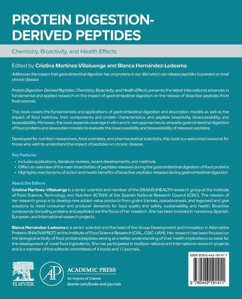 Protein Digestion-Derived Peptides: Chemistry, Bioactivity, and Health Effects presents the latest international advances in fundamental and applied research on the impact of gastrointestinal digestion on the release of bioactive peptides from food sources. This book covers the fundamentals and applications of gastrointestinal digestion and absorption models as well as the impact of food matrices, their components and protein characteristics, and peptide bioactivity, bioaccessibility, and bioavailability. Moreover, the book expands coverage in vitro and in vivo approaches to simulate gastrointestinal digestion of food proteins and absorption models to evaluate the bioaccessibility and bioavailability of released peptides. Developed for nutrition researchers, food scientists, and pharmaceutical scientists, this book is a welcomed resource for those who wish to understand the impact of peptides on chronic disease.