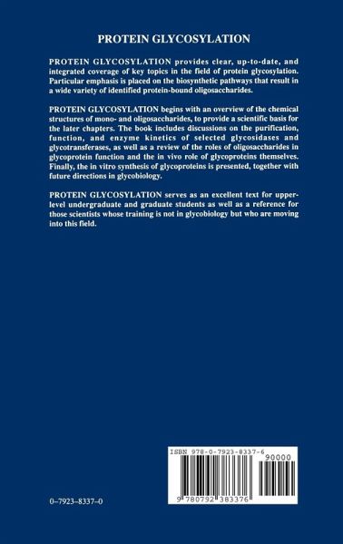 Protein Glycosylation provides clear, up-to-date, and integrated coverage of key topics in this field. Particular emphasis is placed on the biosynthetic pathways that result in a wide variety of identified protein-bound oligosaccharides. Protein Glycosylation begins with an overview of the chemical structures of mono- and oligosaccharides, to provide a scientific basis for the later chapters. The book includes discussions on the purification, function, and enzyme kinetics of selected glycosidases and glycotransferases, as well as a review of the roles of oligosaccharides in glycoprotein function and the in vivo role of glycoproteins themselves. Finally, the in vitro synthesis of glycoproteins is presented, together with future directions in glycobiology.