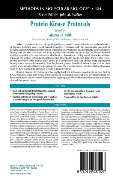 As key components of many cell signaling pathways, protein kinases are implicated in a broad variety of diseases, including cancers and neurodegenerative conditions, and offer considerable potential as tractable targets for therapeutic intervention. In Protein Kinase Protocols, a panel of highly skilled laboratory investigators describe both basic and more sophisticated methods for the analysis of kinase-mediated signaling cascades, with emphasis on the identification of proteins according to their interactive relationships and the analysis of their functional properties. Described in step-by-step detail, these readily reproducible techniques offer novices quick access to a complicated field, and provide more experienced investigators many novel time-saving ploys. Emphasis is given to the critical technical steps that are often omitted from methods published in the primary literature. There are also tips on potential pitfalls and copious notes on how to adjust the protocols to work in related systems.