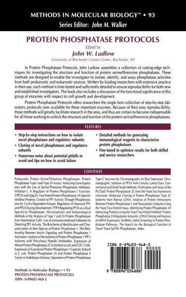 A major mechanism by which cells regulate protein function is to place phosphate groups on serine and threonine residues. Though the steady-state level of protein phosphorylation depends on the relative activities of both kinases and phosphatases, a much greater effort has previously gone into the study of the former that the latter . Today, however, there is an increasing appreciation for the role that protein phosphatases play in the dynamic p- cess of protein phosphorylation . To date, there are four major types of protein serine/threonine phosphatase catalytic subunits, designated protein phosphatase type 1, 2A, 2B, and 2C . Each has been identified by the techniques of protein chemistry and enzymology and can be distinguished from one another by their preference for specific substrates as well as their sensitivity to certain acti- tors and inhibitors . Protein Phosphatase Protocols has been assembled in response to the growing interest these enzymes are receiving . The goal of this compilation is to provide a "how-to" experimental guide to aid newcomers as well as s- soned veterans in their research endeavors, thus further contributing towards our ever increasing knowledge of serine/threonine phosphatases . What you have before you contains contributions by many of the current and emerging leaders in the field . To highlight just a few, these chapters c- tain step-by-step information on how to isolate novel phosphatases and re- latory subunits, assay for activity, and generate immunological reagents for both biochemical and biological characterization of these enzymes .