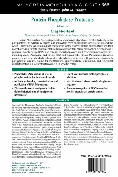 Analysis of Protein Phosphatases.- A Brief Introduction to the Protein Phosphatase Families.- Small-Molecule Inhibitors of Ser/Thr Protein Phosphatases.- Synthesis and Use of the Protein Phosphatase Affinity Matrices Microcystin-Sepharose and Microcystin-Biotin-Sepharose.- Utilizing Protein Phosphatase Inhibitors to Define PP2A as a Regulator of Ataxia-Telangiectasia Mutated.- An Automated Fluorescence-Based Method for Continuous Assay of PP2A Activity.- An In Vivo Assay to Quantify Stable Protein Phosphatase 2A (PP2A) Heterotrimeric Species.- Mutagenesis and Expression of the Scaffolding A? and A? Subunits of PP2A.- Isolation and Characterization of PP2A Holoenzymes Containing FLAG-Tagged B Subunits.- Purification of PP2A Holoenzymes by Sequential Immunoprecipitation with Anti-Peptide Antibodies.- Purification of PP2Ac from Bovine Heart.- Visualization of Intracellular PP1 Targeting Through Transiently and Stably Expressed Fluorescent Protein Fusions.- Yeast Two-Hybrid Screens to Identify Drosophila PP1-Binding Proteins.- Identification of Cellular Protein Phosphatase-1 Regulators.- Assay for Three-Way Interaction of Protein Phosphatase-1 (Glc7) With Regulatory Subunits Plus Phosphatase Inhibitor-2.- Phosphorylation of the Protein Phosphatase Type 1 Inhibitor Protein CPI-17 by Protein Kinase C.- Purification of Smooth Muscle Myosin Phosphatase Using a Thiophosphorylated Myosin Light-Chain-Affinity Resin.- Proteins Interacting With Saccharomyces cerevisiae Type 1 Protein Phosphatase Catalytic Subunit Identified by Single-Step Affinity Purification and Mass Spectrometry.- Expression of Protein Histidine Phosphatase in Escherichia coli, Purification, and Determination of Enzyme Activity.- The Use of RNA Interference to Analyze Protein Phosphatase Function in MammalianCells.- Recognition of a PP2C Interaction Motif in Several Plant Protein Kinases.- Use of Yeast Genetic Tools to Define Biological Roles of Novel Protein Phosphatases.- Targeting of PP2C in Budding Yeast.- Phosphatase Targets in TOR Signaling.- Functional Characterization of Small CTD Phosphatases.- Genome-Scale Discovery and Characterization of Class-Specific Protein Sequences.- Yeast Substrate-Trapping System for Isolating Substrates of Protein Tyrosine Phosphatases.