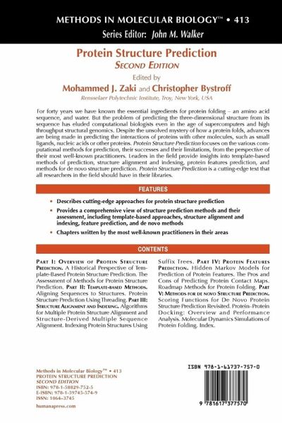 Preface.- Contributors.- I: Overview of Protein Structure Prediction.- A Historical Perspective of Template-Based Protein Structure PredictionJun-tao Guo, Kyle Ellrott, and Ying Xu.- The Assessment of Methods for Protein Structure PredictionAnna Tramontano, Domenico Cozzetto, Alejandro Giorgetti, and Domenico Raimondo.- II: Template-based Methods.- Aligning Sequences to StructuresLiam James McGuffin.- Protein Structure Prediction Using ThreadingJinbo Xu, Feng Jiao, and Libo Yu.- III: Structure Alignment and Indexing.- Algorithms for Multiple Protein Structure Alignment and Structure-Derived Multiple Sequence AlignmentMaxim Shatsky, Ruth Nussinov, and Haim J. Wolfson.- Indexing Protein Structures Using Suffix TreesFeng Gao and Mohammed J. Zaki.- IV: Protein Features Prediction.- Hidden Markov Models for Prediction of Protein FeaturesBystroff and Krogh.- The Pros and Cons of Predicting Protein Contact MapsLisa Bartoli, Emidio Capriotti, Piero Fariselli, Pier Luigi Martelli, and Rita Casadio.- Road Map Methods for Protein FoldingMark Moll, David Schwarz, and Lydia E. Kavraki.- Scoring Functions for De Novo Protein Structure Prediction RevisitedShing-Chung Ngan, Ling-Hong Hung, Tianyun Liu, and Ram Samudrala.- Protein--Protein Docking: Overview and Performance AnalysisKevin Wiehe, Matthew W. Peterson, Brian Pierce, Julian Mintseris, and Zhiping Weng.- Molecular Dynamics Simulations of Protein FoldingAngel E. Garcia.