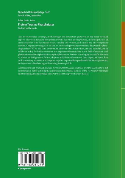 This book provides coverage, methodology, and laboratory protocols on the more essential aspects of protein tyrosine phosphatase (PTP) function and regulation, including the use of standardized in vitro functional assays, suitable cell systems, and animal and microorganism models. Chapters covering state-of-the-art technical approaches suitable to decipher the physiologic roles of PTPs, and their involvement in tissue-specific functions, are also included, which will be of utility for both newcomers and experienced researchers in the field of tyrosine- and phosphoinositide-…mehr