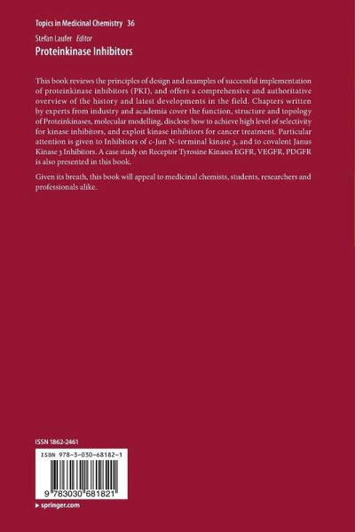 ProteinKinase-Inhibitors: A Story of Success.- Function, Structure and Topology of Proteinkinases.- Molecular Modelling.- Case study on Receptor Tyrosine Kinases EGFR, VEGFR, PDGFR.- Achieving high level of selectivity for kinase inhibitors.- Inhibitors of c-Jun N-terminal kinase 3.- Exploiting kinase inhibitors for cancer treatment - An Overview of Clinical Results and Outlook.- Covalent Janus Kinase 3 Inhibitors.