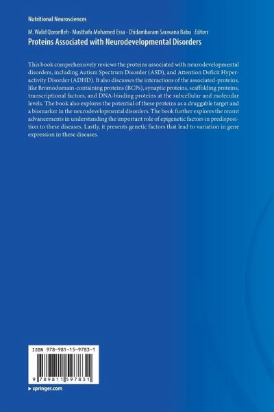 This book comprehensively reviews the proteins associated with neurodevelopmental disorders, including autism spectrum disorder (ASD) and attention deficit hyperactivity disorder (ADHD). It also discusses the interactions of the associated-proteins, like bromodomain-containing proteins (BCPs), kinases, synaptic proteins, scaffolding proteins, transcriptional factors, and DNA-binding proteins at the subcellular and molecular levels. The book also explores the potential of these proteins as a druggable target and a biomarker in the neurodevelopmental disorders. The book further explores the recent advancements in understanding the important role of epigenetic factors in predisposition to these diseases. Lastly, it presents genetic factors that lead to variation in gene expression in these diseases, disorders management via diet intervention and the future potential of stem cell therapy.