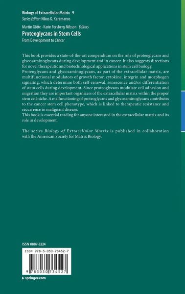 Chapter 1: Heparan Sulfate Proteoglycans in the Stem Cell Niche: Lessons from Drosophila.- Chapter 2: Proteoglycans in zebrafish development.- Chapter 3: The pivotal role of versican turnover by ADAMTS proteases in mammalian reproduction and development.- Chapter 4: Use of chondroitin sulfate to aid in vitro stem cell differentiation.- Chapter 5: Regulatory functions of heparan sulfate in stem cell self-renewal and differentiation.- Chapter 6: Proteoglycans as mediators of neurogenesis and stem cell differentiation.- Chapter 7: Syndecan-3: a signaling conductor in the musculoskeletal system.- Chapter 8: Proteoglycans of the neural stem cell niche.- Chapter 9: Heparan sulfate in normal and cancer stem cells of the brain.- Chapter 10: Hyaluronic acid-CD44 interaction in the physio- and pathological stem cell niche.- Chapter 11: Proteoglycans in glioma stem cells.- Chapter 12: Role of Syndecan-1 in Cancer Stem cells.