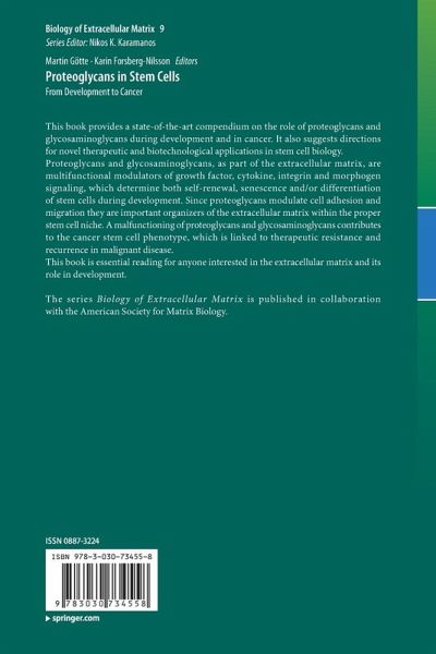 This book provides a state-of-the-art compendium on the role of proteoglycans and glycosaminoglycans during development and in cancer. It also suggests directions for novel therapeutic and biotechnological applications in stem cell biology. Proteoglycans and glycosaminoglycans, as part of the extracellular matrix, are multifunctional modulators of growth factor, cytokine, integrin and morphogen signaling, which determine both self-renewal, senescence and/or differentiation of stem cells during development. Since proteoglycans modulate cell adhesion and migration they are important organizers of the extracellular matrix within the proper stem cell niche. A malfunctioning of proteoglycans and glycosaminoglycans contributes to the cancer stem cell phenotype, which is linked to therapeutic resistance and recurrence in malignant disease. This book is essential reading for anyone interested in the extracellular matrix and its role in development.