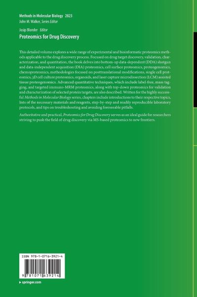 This detailed volume explores a wide range of experimental and bioinformatic proteomics methods applicable to the drug discovery process. Focused on drug target discovery, validation, characterization, and quantitation, the book delves into bottom-up data-dependent (DDA) shotgun and data-independent acquisition (DIA) proteomics, cell surface proteomics, proteogenomics, chemoproteomics, methodologies focused on posttranslational modifications, single cell proteomics, 3D cell culture proteomics, organoids, and laser capture microdissection (LCM) assisted tissue proteogenomics. Advanced quantitative techniques, which include label-free, mass tagging, and targeted immuno-MRM proteomics, along with top-down proteomics for validation and characterization of selected protein targets, are also described. Written for the highly successful Methods in Molecular Biology series, chapters include introductions to their respective topics, lists of the necessary materials and reagents, step-by-step and readily reproducible laboratory protocols, and tips on troubleshooting and avoiding foreseeable pitfalls.