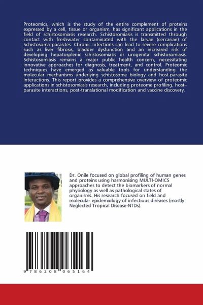 Proteomics, which is the study of the entire complement of proteins expressed by a cell, tissue or organism, has significant applications in the field of schistosomiasis research. Schistosomiasis is transmitted through contact with freshwater contaminated with the larvae (cercariae) of Schistosoma parasites. Chronic infections can lead to severe complications such as liver fibrosis, bladder dysfunction and an increased risk of developing hepatosplenic schistosomiasis or urogenital schistosomiasis. Schistosomiasis remains a major public health concern, necessitating innovative approaches for diagnosis, treatment, and control. Proteomic techniques have emerged as valuable tools for understanding the molecular mechanisms underlying schistosome biology and host-parasite interactions. This report provides a comprehensive overview of proteomic applications in schistosomiasis research, including proteome profiling, host-parasite interactions, post-translational modification and vaccine discovery.