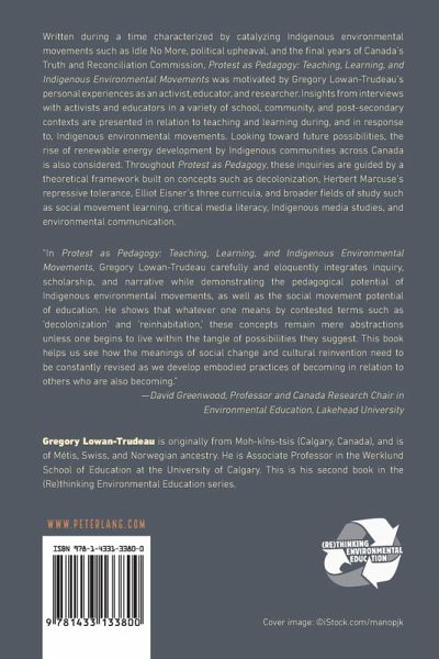 Written during a time characterized by catalyzing Indigenous environmental movements such as Idle No More, political upheaval, and the final years of Canada's Truth and Reconciliation Commission, Protest as Pedagogy: Teaching, Learning, and Indigenous Environmental Movements was motivated by Gregory Lowan-Trudeau's personal experiences as an activist, educator, and researcher. Insights from interviews with activists and educators in a variety of school, community, and post-secondary contexts are presented in relation to teaching and learning during, and in response to, Indigenous environmental movements. Looking toward future possibilities, the rise of renewable energy development by Indigenous communities across Canada is also considered. Throughout Protest as Pedagogy, these inquiries are guided by a theoretical framework built on concepts such as decolonization, Herbert Marcuse's repressive tolerance, Elliot Eisner's three curricula, and broader fields of study such as social movement learning, critical media literacy, Indigenous media studies, and environmental communication.