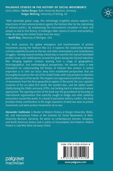 This book assesses the emergence and transformation of global protest movements during the Vietnam War era. It explores the relationship between protest focused on the war and other emancipatory and revolutionary struggles, moving beyond existing scholarship to examine the myriad interlinked protest issues and mobilisations around the globe during the Indochina Wars. Bringing together scholars working from a range of geographical, historiographical and methodological perspectives, the volume offers a new framework for understanding the history of wartime protest. The chapters are organised around the social movements from the three main geopolitical regions of the world during the 1960s and early 1970s: the core capitalist countries of the so-called first world, the socialist bloc and the Global South. The final section of the book then focuses on international organisations that explicitly sought to bridge and unite solidarity and protest around the world. In an era of persistent military conflict, the book provides timely contributions to the question of what war does to protest movements and what protest movements do to war.