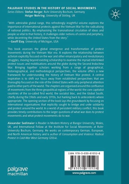 Chapter 1: Protest in the Era of the Indochina Wars: Upending Centre and Periphery By Alexander Sedlmaier.- Part 1: Bridging the Worlds: International Organisations.- Chapter 2: "To go further than words alone": The World Peace Council and the Global Orchestration of Vietnam War Campaigns During the 1960s By Kim Christiaens.- Chapter 3: The Vietnam Activities of the Women's International Democratic Federation (WIDF) By Francisca de Haan.- Part 2: State Socialism: Second-World solidarity, Propaganda, and Humanitarianism from Above and from Below.- Chapter 4: The Soviet Public and the Vietnam War: Political Mobilization, Public Organizations, and Activism, 1965-1973 By Julie Hessler.- Chapter 5: Between Anti-Imperialism and Anti-Communism: Poland and International Solidarity with Vietnam By Idesbald Goddeeris.- Chapter 6: The Engineering of Political Equidistance and Its Consequences: The Vietnam War and Popular Protest in Yugoslavia By Sabine Rutar & Radina Vucetic.- Part 3: The Capitalist Core: First World Activists Reach Out to Emancipatory and Revolutionary Movements Across the Globe.- Chapter 7: Vietnam War Protest and Solidarity in West Germany By Freia Anders & Alexander Sedlmaier.- Chapter 8: France's Two Vietnams: Intellectual Protest Politics in Perspective By Silja Behre.- Chapter 9: The Japanese New Left, the Vietnam War, and Anti-Imperial Protest By Alex Finn Macartney.- Part 4: The Global South: Emancipation, anti-colonialism, Third Worldism.- Chapter 10: The Vietnam War, Maoism, and the Cultural Revolution: Propaganda and Mobilization in the People's Republic of China By Kazushi Minami.- Chapter 11: The Vietnam War, Protest, and Democratization in South Korea By Tae Yang Kwak.- Chapter 12: The Vietnam War in Africa By Dan Hodgkinson & Luke Melchiorre.- Chapter 13: Revolutionary Soulmates? Cuba's Slow Discovery of Vietnam By Antoni Kapcia.- Chapter 14: Singing in Solidarity: The Latin American Protest-Song Movement and the Vietnam War By MatíasHermosilla.