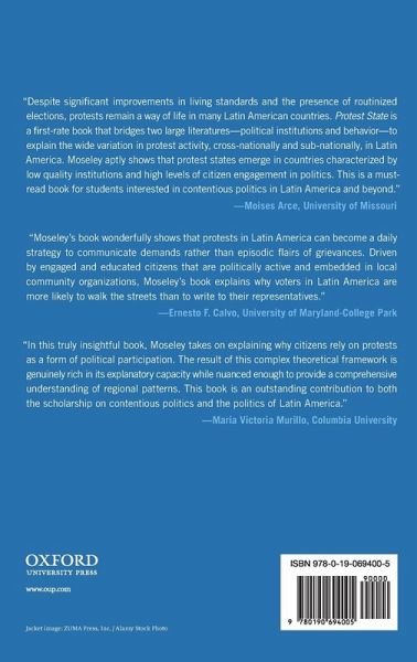 Why is social protest a normal, almost routine form of political participation in certain Latin American democracies, but not others? In light of surging protests in countries like Argentina, Brazil, and Peru, this book answers this question through a focus on recent trends in the quality of governance and socioeconomic development in the region. Specifically, it argues that increasingly engaged citizenries -- forged by economic growth and technological advances -- coupled with dysfunctional political institutions have fueled more radical modes of participation in Latin America, as citizens' demands for government responsiveness have overwhelmed many regimes' capacity to provide it. Where weak institutions and politically engaged citizenries collide, countries can morph into "protest states," where contentious participation becomes so common as to render it a conventional characteristic of everyday political life. Drawing on cross-national surveys from Latin America and a case study of Argentina, which includes a rich dataset of protest events and dozens of interviews with political elites and citizen activists, Mason W. Moseley tests his explanation against other leading theories in the contentious politics literature. But rather than emphasizing how worsening economic conditions and mounting grievances fuel protest, this book builds the case that it is actually the improvement of economic conditions amidst low quality political institutions that lies at the root of surging contention in the region. Protest State offers a comprehensive study of one of the most intriguing puzzles in Latin American politics today: in the midst of an unprecedented era of democratic governments and economic prosperity, why are so many people protesting?