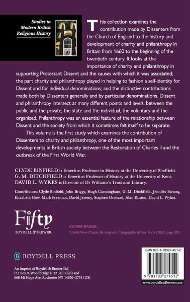 Philanthropy was an essential feature of the relationship between Dissent and the society from which it sometimes felt itself to be separate. This collection examines the contribution made by Dissenters from the Church of England to the history and development of charity and philanthropy in Britain from 1660 to the beginning of the twentieth century. It looks at the importance of charity and philanthropy in supporting Protestant Dissent and the causes with which it was associated; the part charity and philanthropy played in helping to fashion a self-identity for Dissent and for individual denominations; and the distinctive contributions made both by Dissenters generally and by particular denominations. Dissent and philanthropy intersect at many different points and levels: between the public and the private, the state and the individual, the voluntary and the organized. Philanthropy was an essential feature of the relationship between Dissent and the society from which it sometimes felt itself to be separate. Each chapter not only covers the contribution of a particular denomination but forms a case study of a wider aspect of charitable or philanthropic activity within Dissent as a whole. This volume is the first study which examines the contribution of Dissenters to charity and philanthropy, one of the most important developments in British society between the Restoration of Charles II and the outbreak of the First World War. CLYDE BINFIELD is Emeritus Professor in History at the University of Sheffield. His publications have concentrated on nonconformist history, in particular its social, cultural, and political contexts, from the late eighteenth century to the mid twentieth century. G. M. DITCHFIELD is Emeritus Professor of History at the University of Kent. His publications include The Evangelical Revival, George III. An Essay in Monarchy, and The Letters of Theophilus Lindsey (1723-1808). DAVID L. WYKES is Director of Dr Williams's Trust and Library. He edited Parliament and Dissent with Stephen Taylor and, with Isabel Rivers, Joseph Priestley, Scientist, Philosopher, and Theologian and Dissenting Praise. CONTRIBUTORS: Clyde Binfield, John Briggs, Hugh Cunningham, G. M. Ditchfield, Jennifer Farooq, Mark Freeman, Elizabeth Gow, David Jeremy, Stephen Orchard, Alan Ruston, David L. Wykes