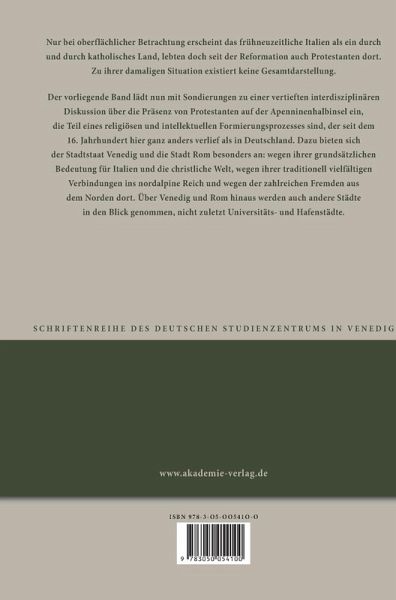 Nur bei oberflächlicher Betrachtung erscheint das frühneuzeitliche Italien als ein durch und durch katholisches Land, lebten doch seit der Reformation auch Protestanten dort. Zu ihrer damaligen Situation existiert keine Gesamtdarstellung. Der vorliegende Band lädt nun mit Sondierungen zu einer vertieften interdisziplinären Diskussion über die Präsenz von Protestanten auf der Apenninenhalbinsel ein, die Teil eines religiösen und intellektuellen Formierungsprozesses sind, der seit dem 16. Jahrhundert hier ganz anders verlief als in Deutschland. Dazu bieten sich der Stadtstaat Venedig und die Stadt Rom besonders an: wegen ihrer grundsätzlichen Bedeutung für Italien und die christliche Welt, wegen ihrer traditionell vielfältigen Verbindungen ins nordalpine Reich und wegen der zahlreichen Fremden aus dem Norden dort. Über Venedig und Rom hinaus werden auch andere Städte in den Blick genommen, nicht zuletzt Universitäts- und Hafenstädte.