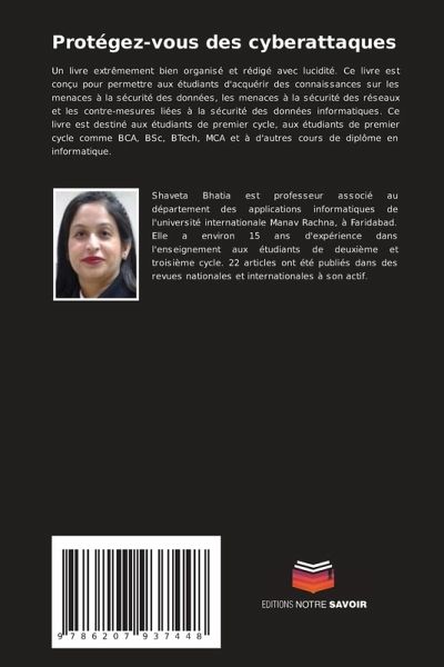 Un livre extrêmement bien organisé et rédigé avec lucidité. Ce livre est conçu pour permettre aux étudiants d'acquérir des connaissances sur les menaces à la sécurité des données, les menaces à la sécurité des réseaux et les contre-mesures liées à la sécurité des données informatiques. Ce livre est destiné aux étudiants de premier cycle, aux étudiants de premier cycle comme BCA, BSc, BTech, MCA et à d'autres cours de diplôme en informatique.